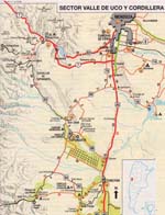 We head back towards Mendoza and then head south. Route-finding is difficult at first. Eventually we get onto route 79 which is flat but pleasant in its way, running between vineyards and orchards. Half way along it turns to hard earth. It joins route 86 which is soul-destroyingly straight and runs through increasingly dry scenery, gaining a narrow ridge and then descending to Tupungato, where we stay at the Hostería Don Rómulo, a simpler place than we are used to, but convenient since it is Don Rómulo who has organised our mules. The weather forecast predicts improvement by the end of the week. Don Rómulo is encouraging about the prospects for our return journey, saying that when summer temperatures return the snow will quickly melt. But we delay our plans by one day. Note: Tupungato has all facilities: a good supermarket, a post office, and banks with ATMs. The sketch map is scanned from the Turistel guide, but corrects a couple of errors. Weds 2: day ride (35km, 460m) In