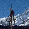 Kapkot was big enough to have large banks but dismayingly no hotel. The appealing freshly-painted PWD was in theory stayable; in practice full. Try Bharari Bazaar, they said. Bharari Bazaar was one big fireworks emporium with one hotel, the Glashiar, a smoke-black tea stall downstairs, scruffy candy pink and blue concrete upstairs. It comprised a number of tiny cell-like rooms, with beds barely more than trestles, one shared lav, a water hose gurgling down to somewhere in the black kitchen below: about as grim as it gets in looks, but actually pretty clean, and the owners as pleasant as any. It was a pity about the all-night yakking from the old guys in the next room. I set my mind to a calm meditative state and tried to distance myself from the tests and trials of this human life, with limited success. It wasnt far up the road to Song. On the ride up we encountered many more roads leading from our main road than are shown on the Nest and Wings map, and we tried to majority-vote from our three or four inconsistent maps what villages there were, and speculated where the roads might go if we were a road and wanted to go somewhere sensible. Songs part of the Danu bros empire and here were our guys and some biscuits. Pankaj was very insistent on taking most of our luggage for the next stage. We resisted, for after all, it was only a few km to Loharkhet. Then we saw the road. We were casting about looking for a sensible way up the hillside when Pankaj indicated something we had first mistaken for a drystone wall. We hurled ourselves at it and conquered the first section, hoping something about it would relent. It did not, but I suppose it showed some variety in its tortures so that when for example we had to haul the bikes over the crevasses of a landslide at least we were spared the desperate eyeballs on stalks balancing act of trying to keep upright and the wheels moving over a steeply raked boulder field. The reward was that we got to loaf around at Loharkhet for most of the day. The resthouse has spacious grounds and a panoramic view of the valley: finely carved terraces and bright painted houses, green fields and cherry trees in pink blossom, dark forests and craggy mountain ridges. Just below is a rustic and sturdily proportioned shrine, whitewashed walls and great pile of slabs for a roof, faded flags and a small spire. It sits in a small grassy walled with more stone slabs and beyond, the ground falls away out of sight, so the space seems suspended in air thousands of feet above the lower ground. People are working in the fields and we hear them call to each other and to shout to their oxen. A young man with a small flock plays on a pipe. Others pass to and fro on the main mule route we watch another mule train winding in and out of sight towards us, then past the resthouse, then up beyond towards the pass. Dhakuri Khal
