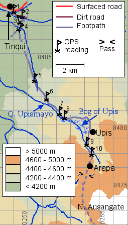 The route we covered was about 50% rideable and needed very little carrying. The passes are probably harder. Route-finding was no problem. However the IGN map is less than averagely accurate, misplacing the Q. Upismayo by a km. The route we followed was probably the best for cyclists, but not perhaps the best for walking.